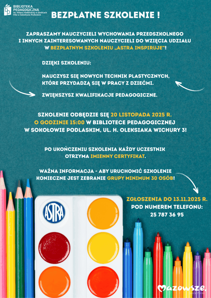 Zapraszamy nauczycieli wychowania przedszkolnego i innych zainteresowanych nauczycieli do wzięcia udziału w bezpłatnym szkoleniu „Astra inspiruje”!